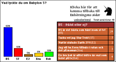 [Tillbaka till Enhörningens huvudsida] Babylon 5 lockade rekordmånga rösterEnhörningens aprilomröstning slog all tidigare röstningsrekord. Hela 40 personer hade något att säga om Babylon 5 och de flesta tycktes vara av den åsikten att B5 var det bästa som hänt inom sf-tv.