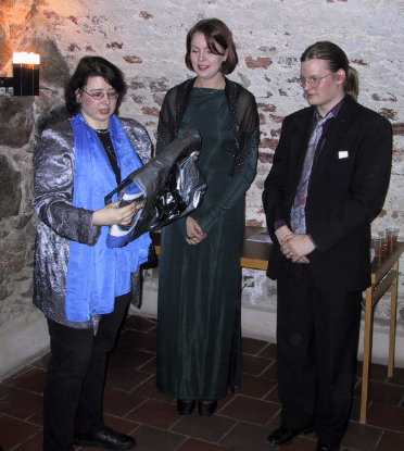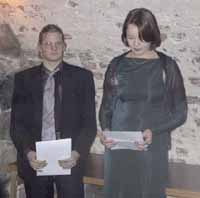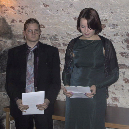 Simo Suntila och Johanna Ahonen håller sitt tal om sf- och sf-fans...